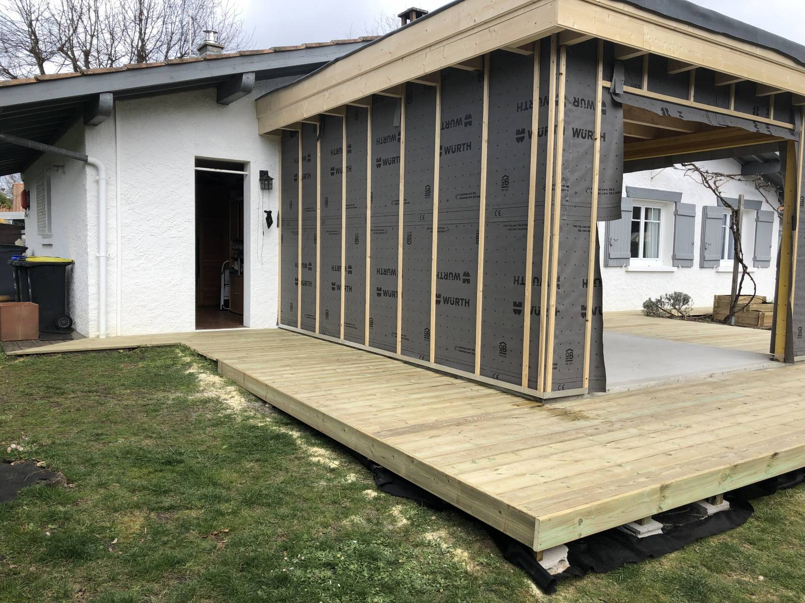 Notre client nous a contacté car il souhaitait agrandir son salon de 20m2. Nous sommes donc intervenu pour créer cet agrandissement. Nous avons commencé par construire l'ossature en bois, puis posé les plaques d'OSB, puis le film par pluie afin de protéger de toute infiltration d'eau. Nous avons fini par poser le bardage en fibro ciment. Cette construction a duré 3 semaines (avec la pose de la terrasse en bois également)