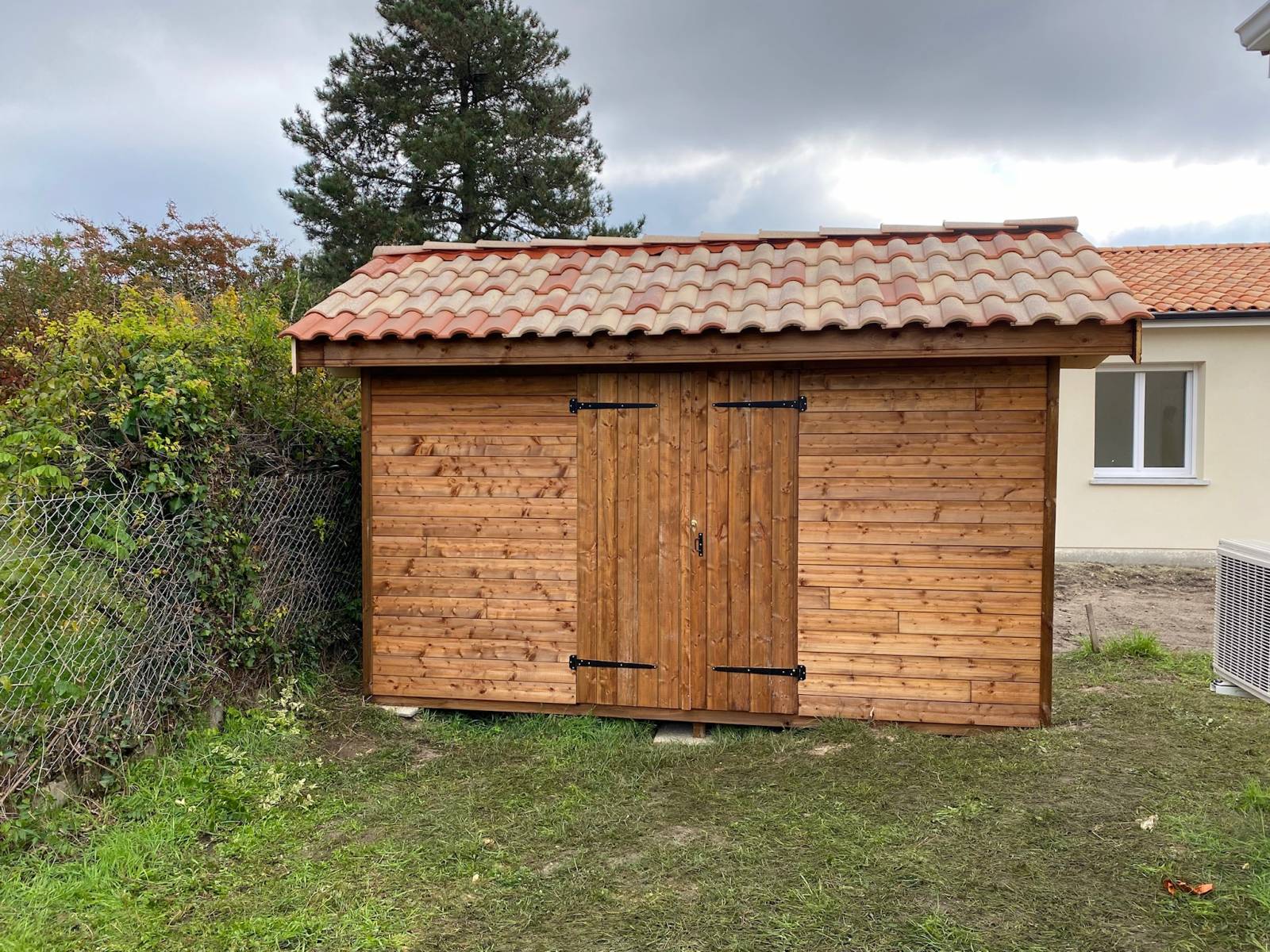 La toiture de cet abri de jardin est en tuile terre cuite identique à celle de la maison de notre client .
