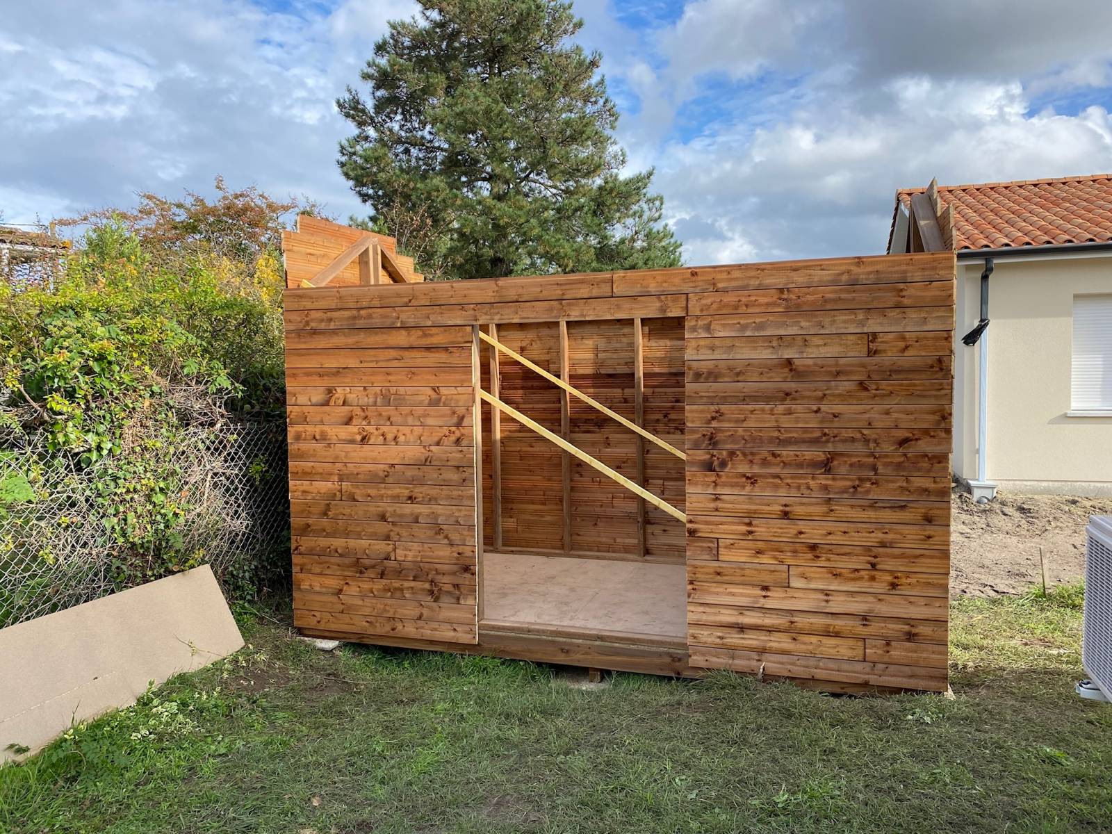 Nous sommes intervenu chez ce client suite a sa demande pour construire un abri de jardin en bois sur mesure , afin de pouvoir ranger son matériel de jardinage , comme la tondeuse et autres accessoires.
