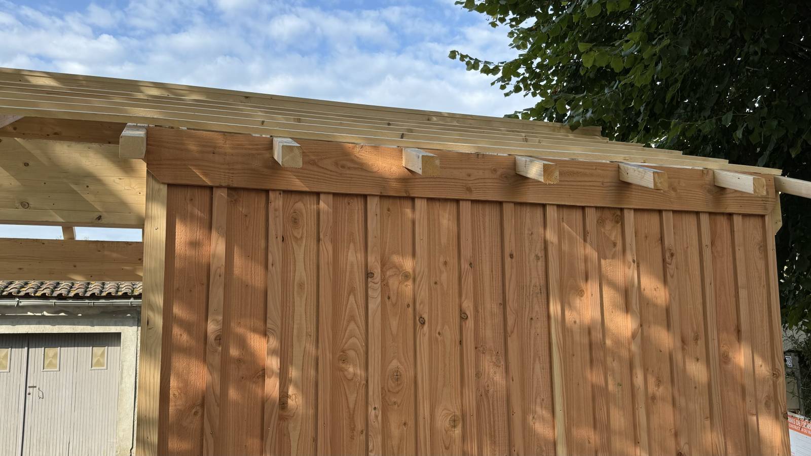 un abri voiture ( espace couvert destiné à protéger un véhicule des intempéries.)ainsi q un abri de jardin ( bâtiment de stockage extérieur, souvent utilisé pour ranger du matériel de jardinage, des outils, ou d'autres objets.)