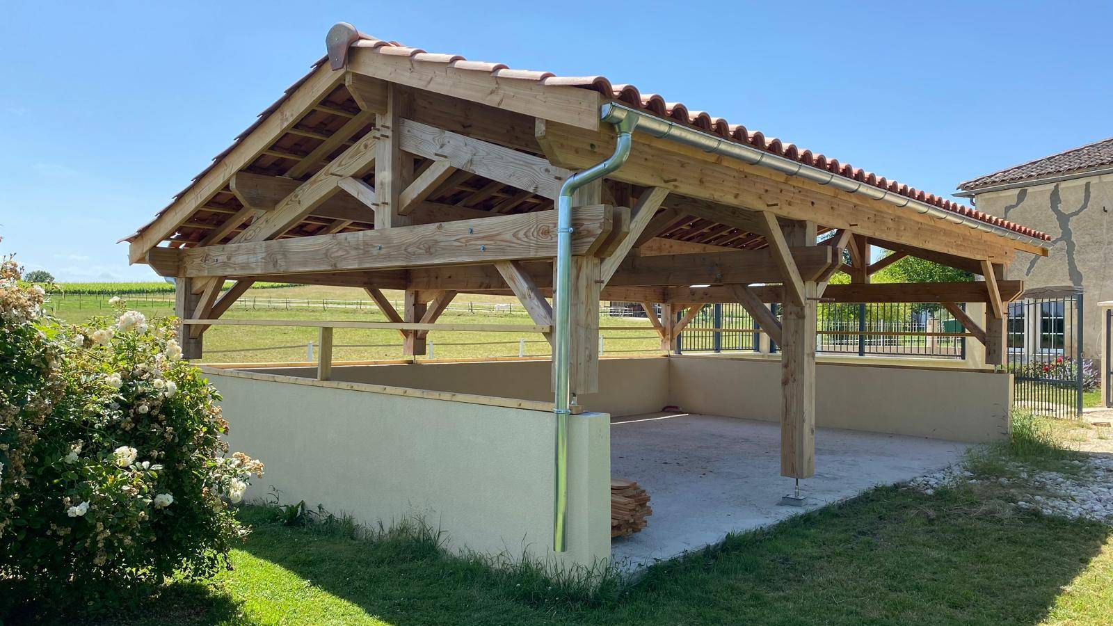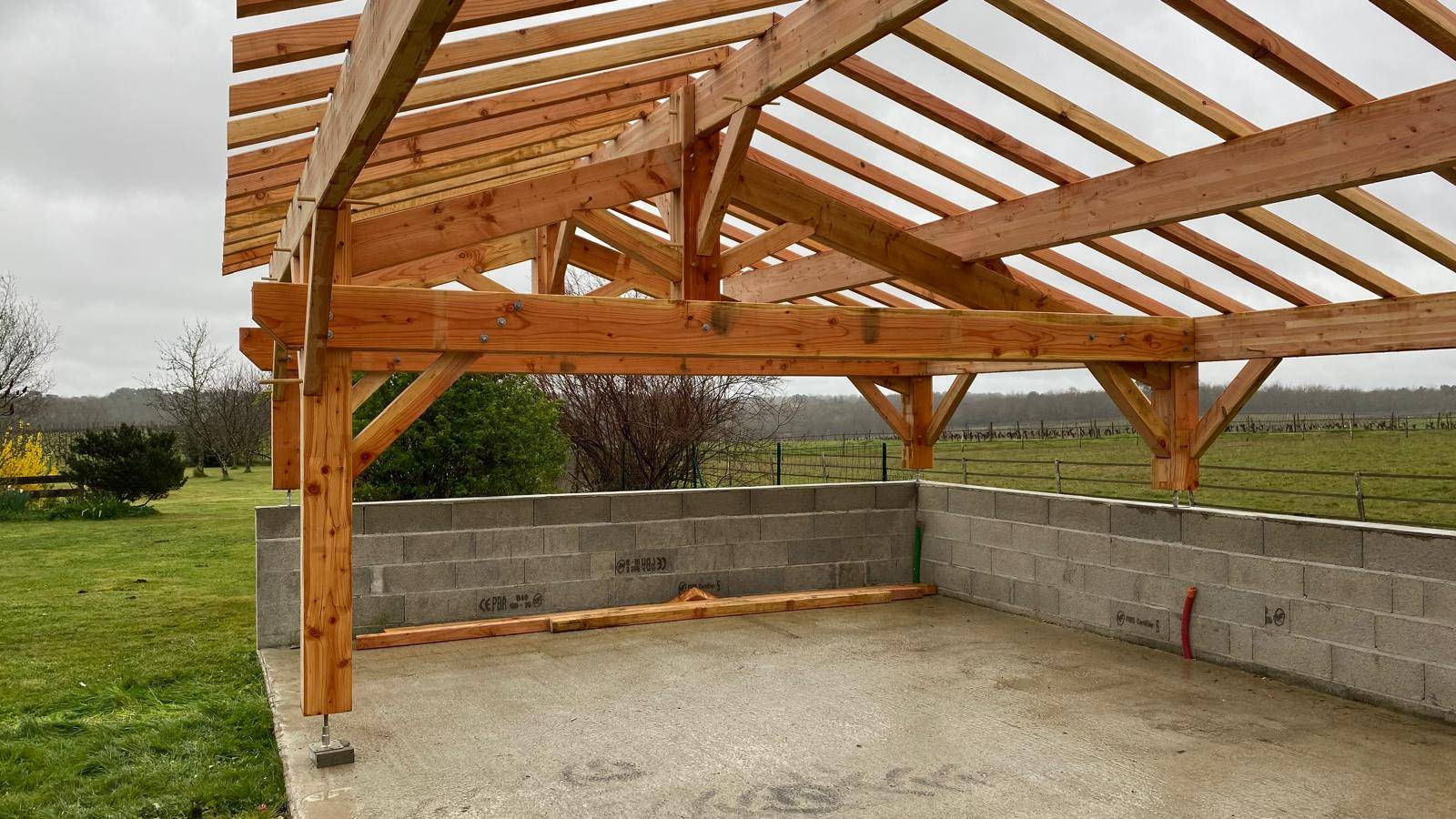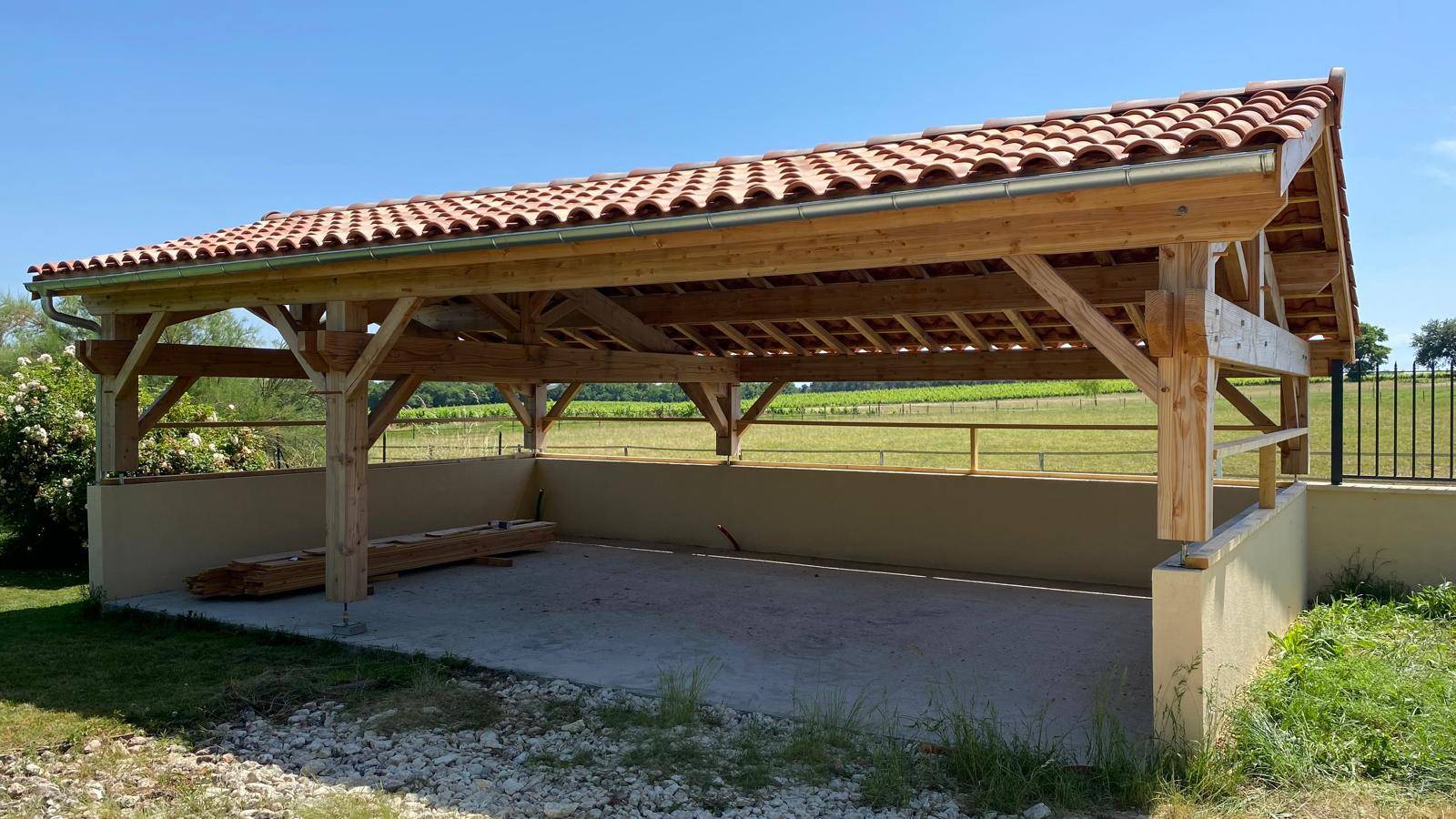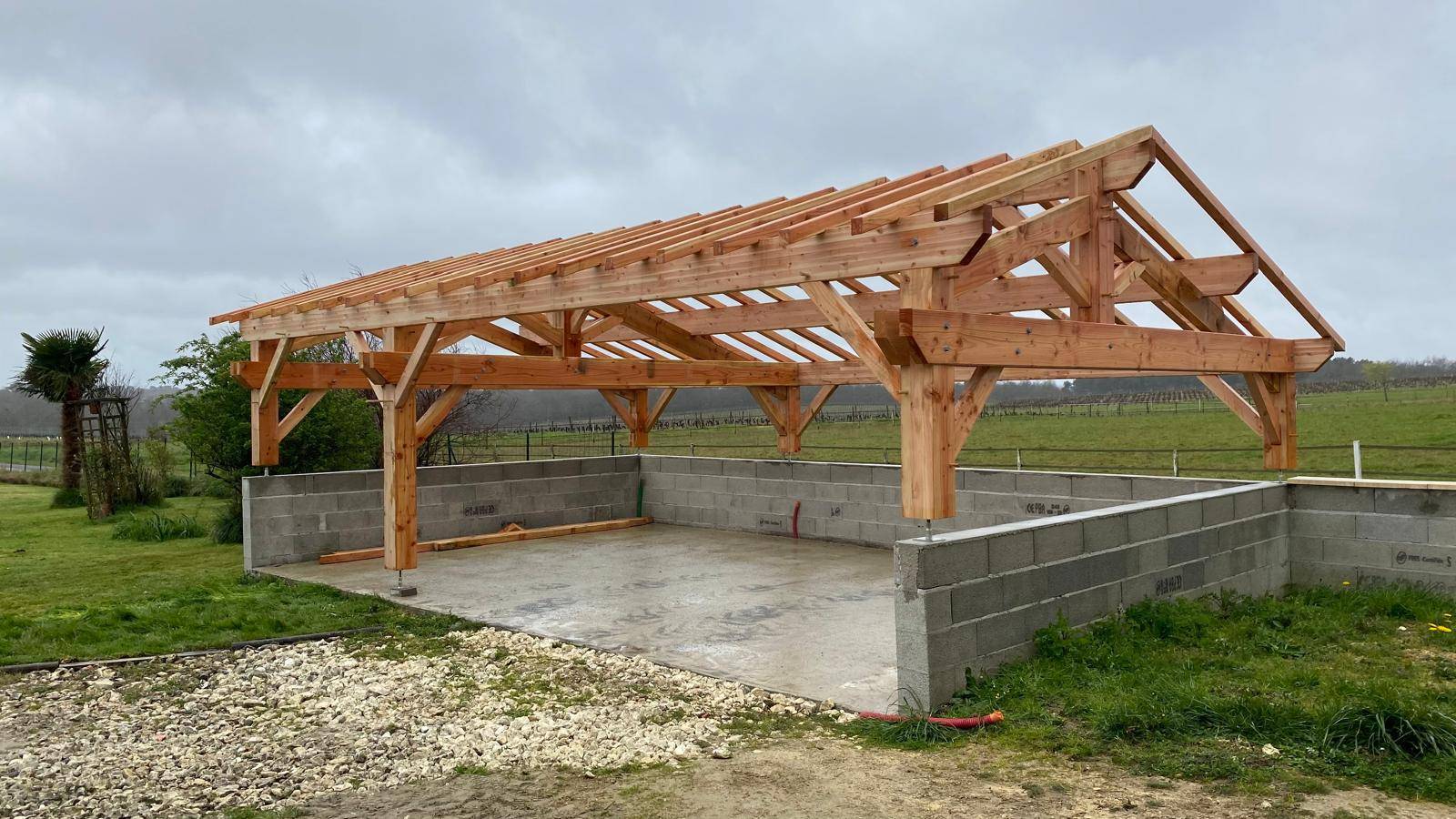 La charpente a été réalisée avec soin afin d’assurer rigidité, stabilité et longévité à l’abri voiture.