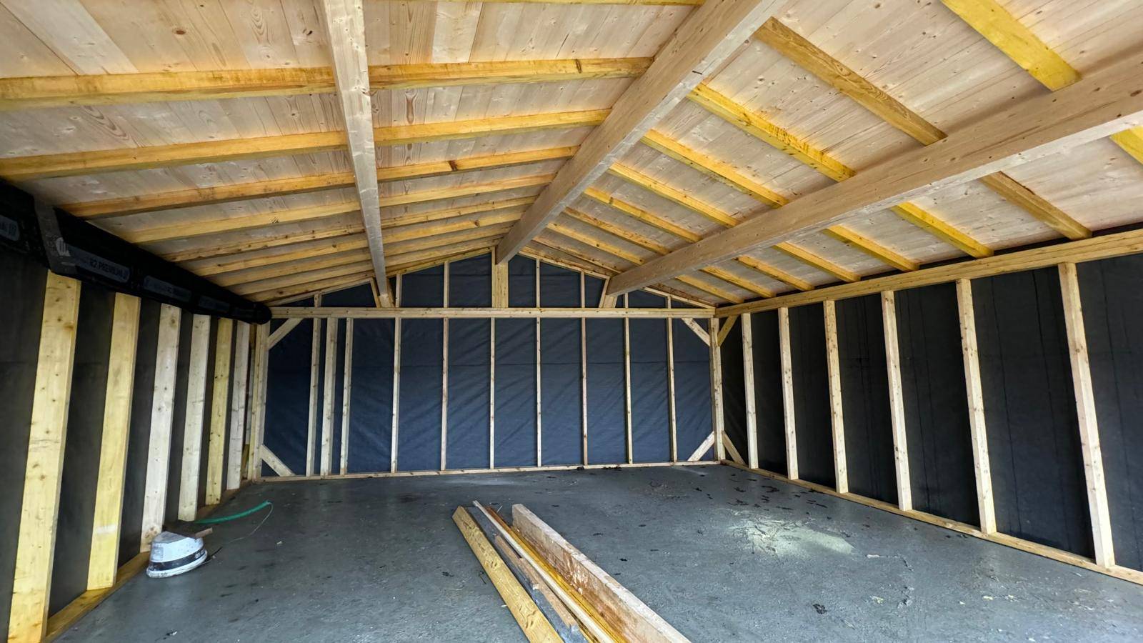 La structure a été réalisée en ossature bois, avec une toiture double pente en tuiles permettant une évacuation efficace des eaux de pluie et une parfaite intégration dans l’environnement architectural local. Le garage est équipé d’une double porte, facilitant l’accès et l’utilisation au quotidien.