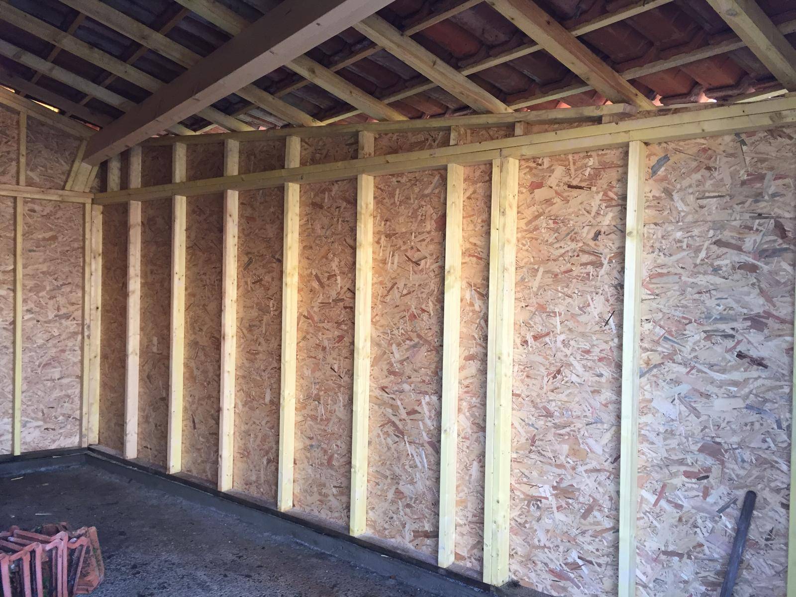 Les parois intérieures sont habillées de panneaux OSB, assurant un contreventement efficace et renforçant la stabilité de la structure.