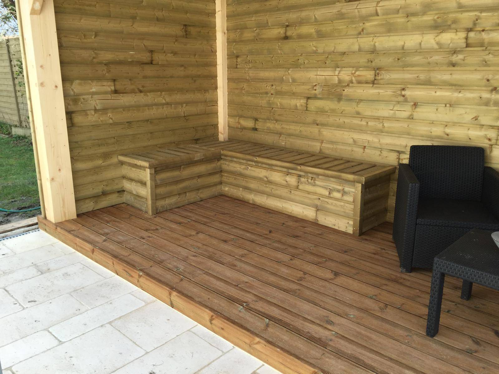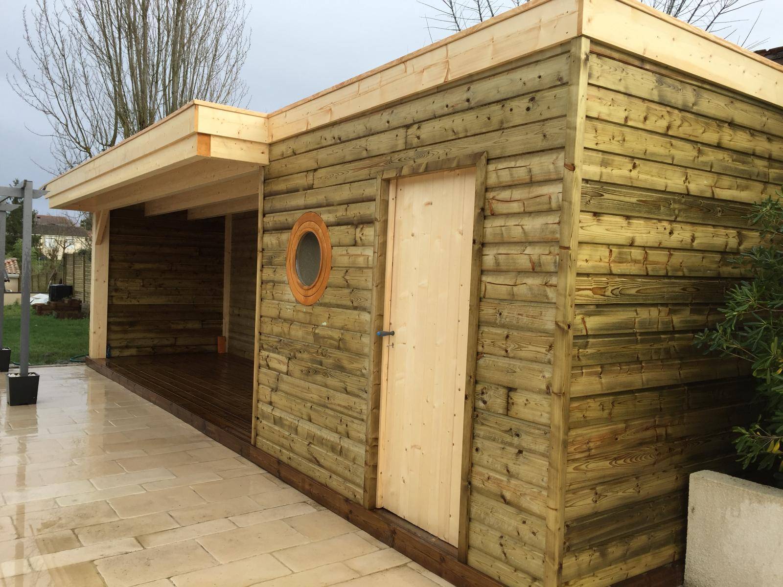 Les finitions ont été particulièrement soignées afin d’obtenir un rendu propre et harmonieux. Les ajustements du bardage, les assemblages et les éléments intégrés comme l’assise et le hublot ont été réalisés avec précision pour un résultat esthétique et durable.