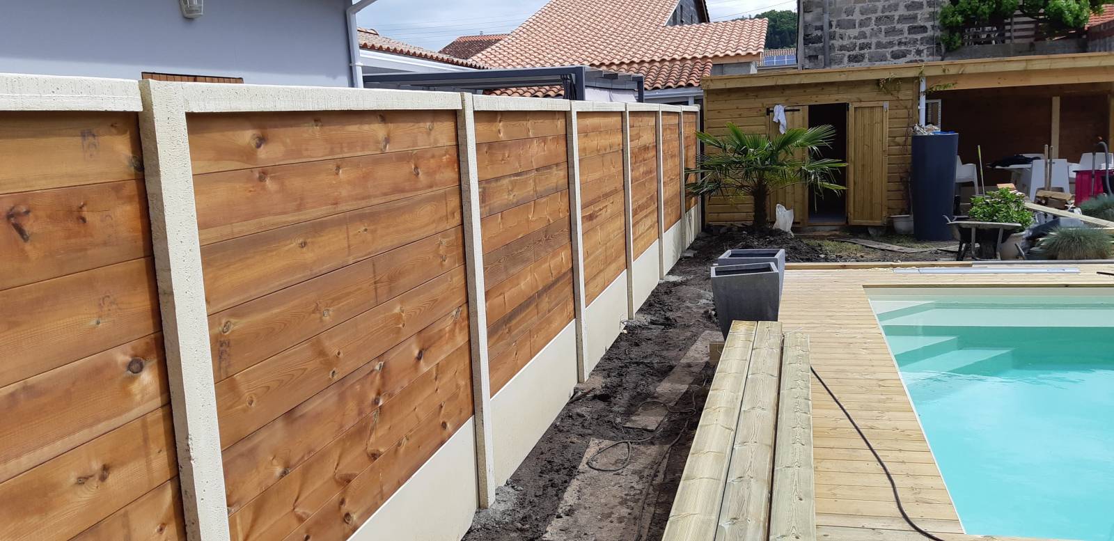 Nous avons dans un 1er temps déposé l'ancienne clôture et évacué celle ci vers la déchetterie professionnelle. Le choix de la clôture bois et béton à été choisi par notre client qui désirait à la fois être caché des voisins pour profiter de sa piscine et également son coté esthétique .