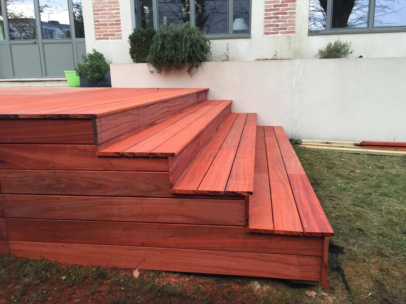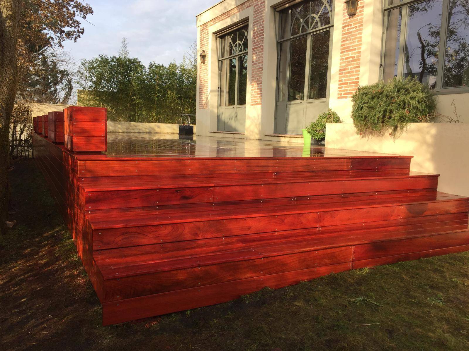 Cette terrasse est réalisée en bois exotique Padouk, essence reconnue pour sa grande durabilité naturelle, sa résistance aux intempéries et sa teinte rouge africain intense, qui apporte un rendu chaleureux et contemporain.