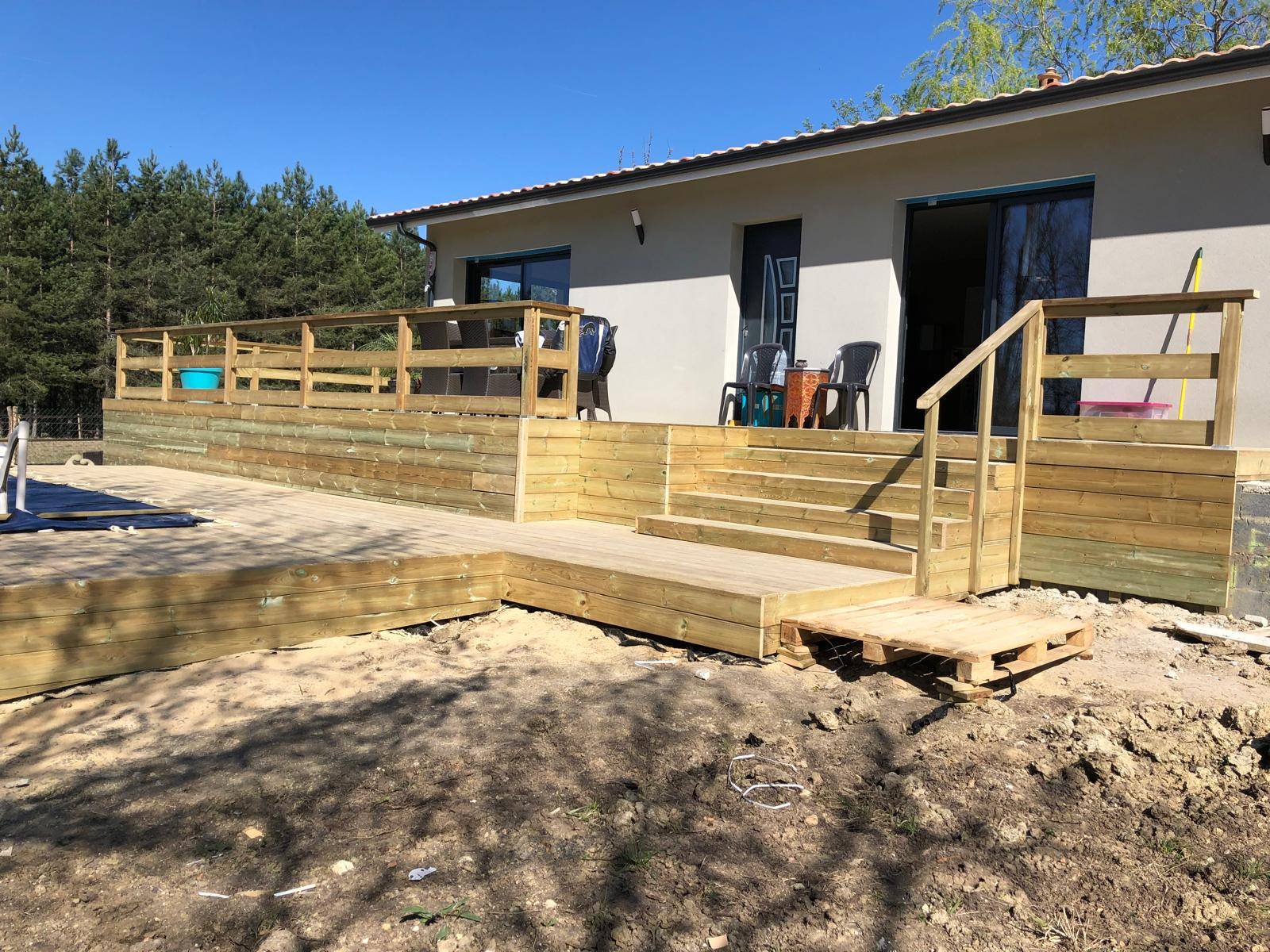 Cette terrasse en bois autoclave avec escalier et garde-corps réalisée à Langoiran, proche de Bordeaux, illustre le travail soigné et le sérieux de l’entreprise Guinard Bois.