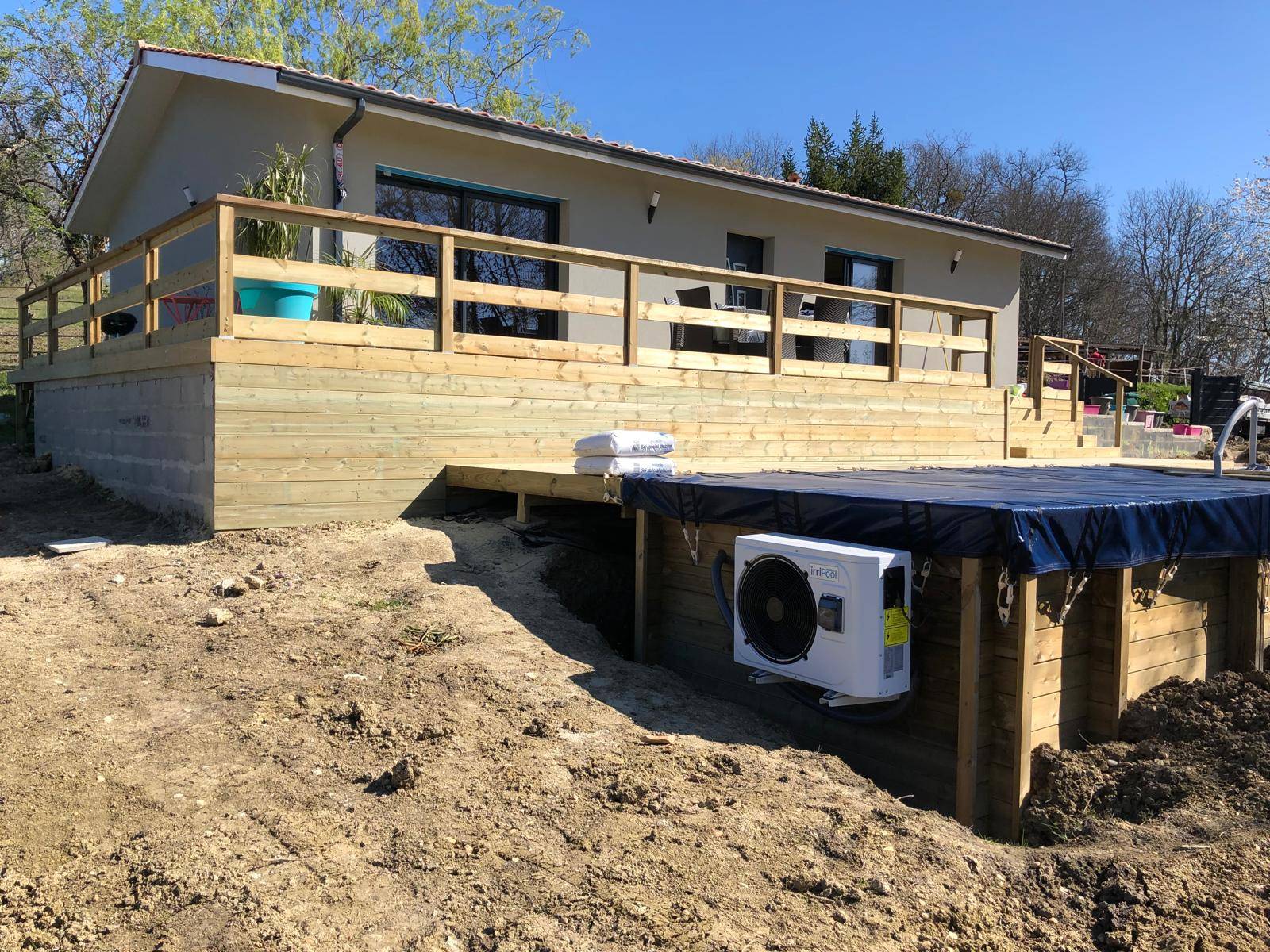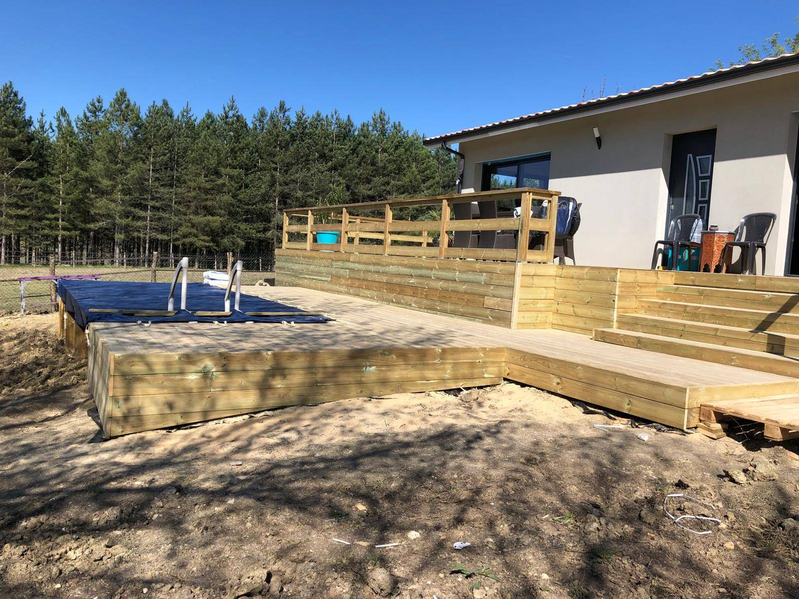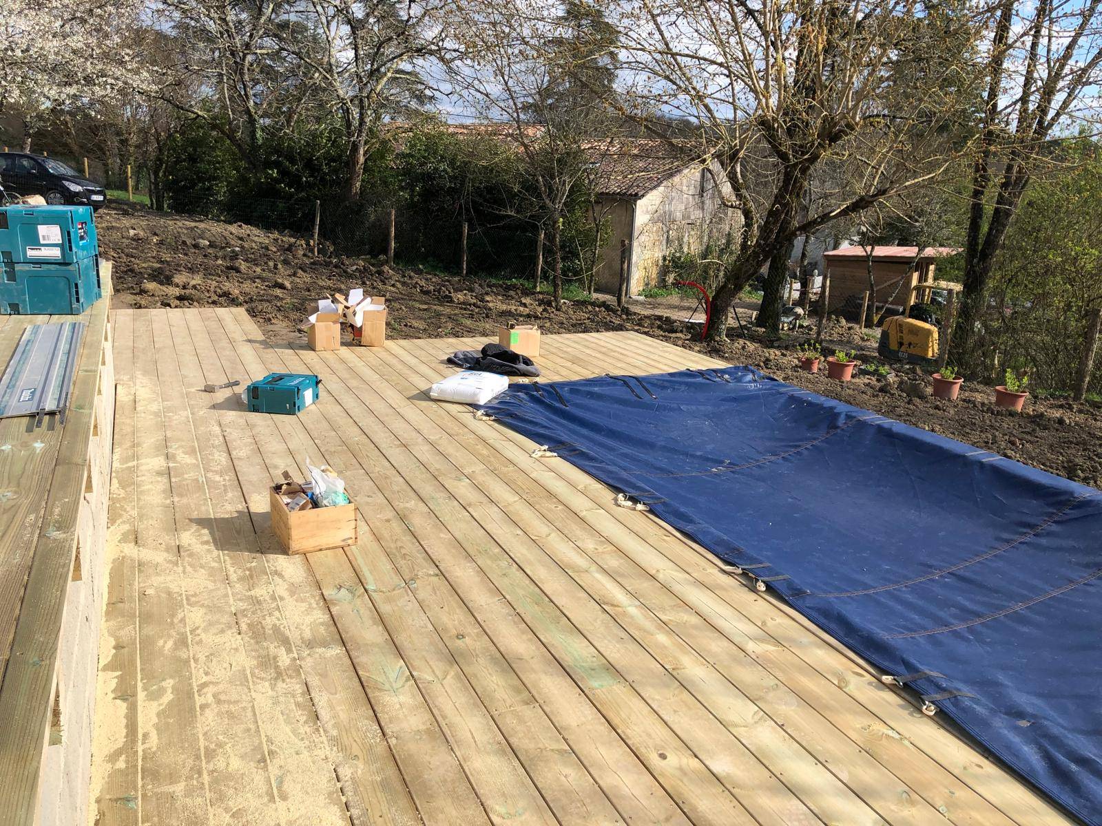 La terrasse est réalisée en bois autoclave classe 4, un matériau parfaitement adapté aux aménagements extérieurs, notamment dans la région de Bordeaux.